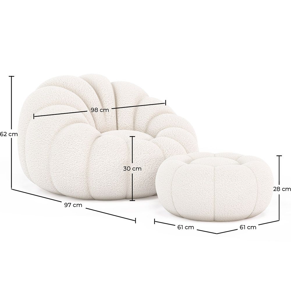 The Calera armchair with footrest, in addition to offering you a comfortable seat, serves as a decorative piece, since its boucle upholstery is a must-have for any decor design lover.